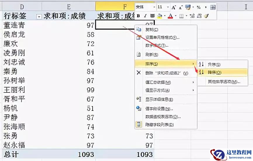 接下来鼠标在F列透视表值区域右键,选择 “降序排列”: