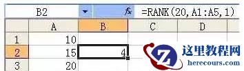 此例中,我们在上面示例的情况下,将order值输入为1,发现结果大变,因为order值为1,意思是求倒数的排名,20在A1:A5 区域内的倒数排名就是4。