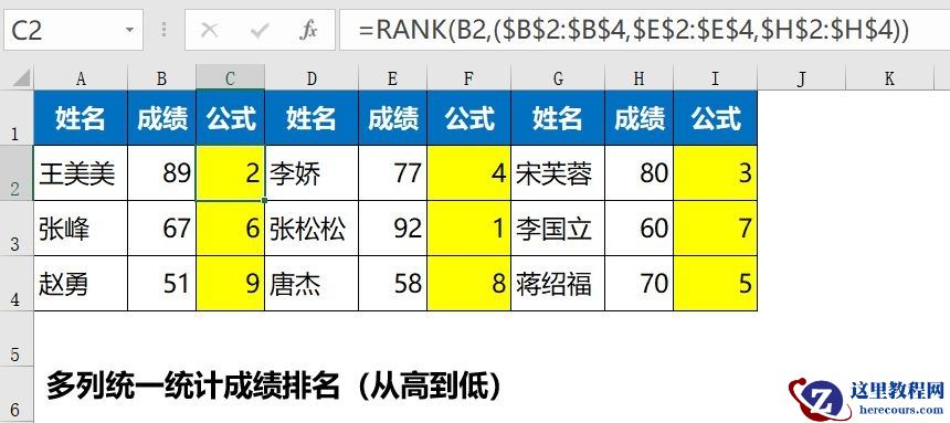=RANK(B2,($B$2:$B$4,$E$2:$E$4,$H$2:$H$4))