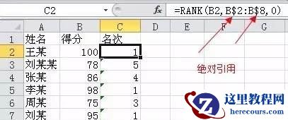 5、我们在点击确定,然后拉动名次的第一个单元格,结果排序不对,是什么原因呢?原来是位置处没有绝对引用,下拉的时候位置发生偏移,所以我们加上$绝对符号,位置是B2-B8不变,然后我们就可以看到正确的排序了。(如果没有觉得引用的话,C2列就是B3-B9了大家选中单元格一看函数就知道错了),如果大家在遇到小得分排名靠前的话,把order的参数改成1即可。