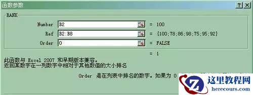 4、第一个参数我们选中B2第一单元格,然后第二单元格是第二列的数据B2-B8;顺序0是降序,1是升序;得分大到小是降序所以选择0;