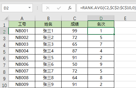 =RANK.AVG(C2,$C$2:$C$10,0)