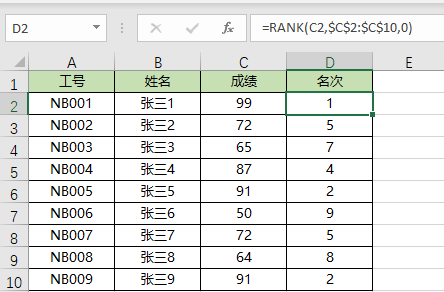 需要注意的是在上面两个排名时函数的第二个参数一定要使用绝对引用,如$C$2:$C$10,不然公式会报错。