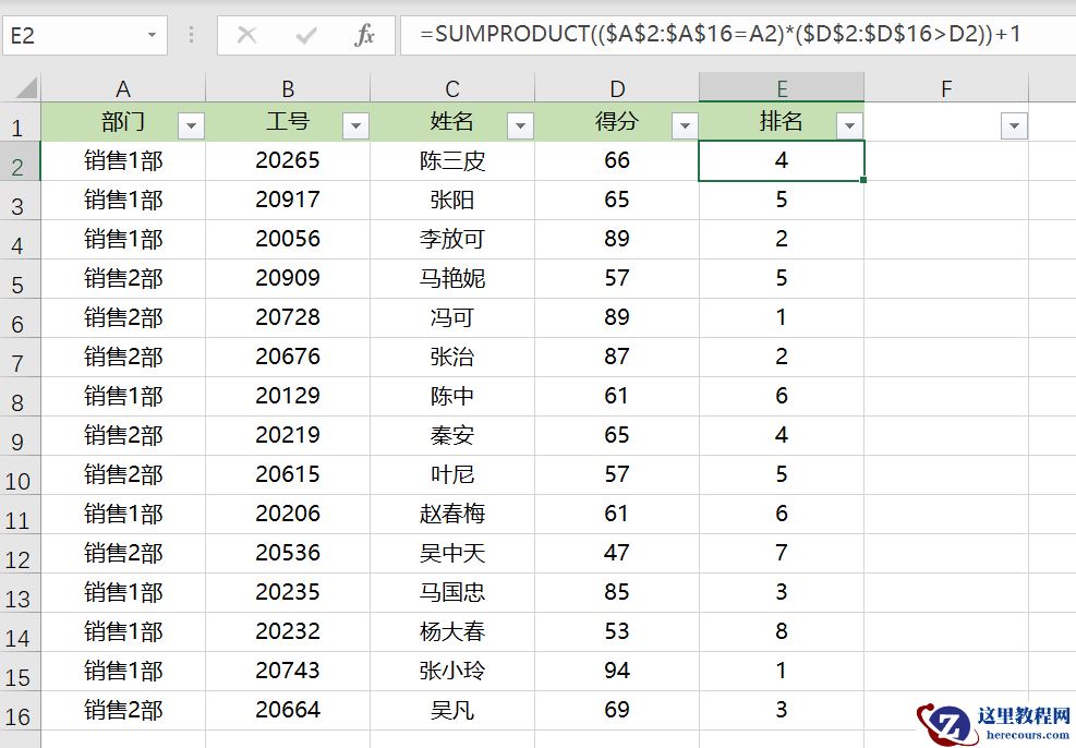 如下图,需要对部门下方的各小部门,分别排名,此时就不再适用Rank函数了。