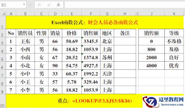 在目标单元格中输入公式:=LOOKUP(F3,$J$3:$K$6)。