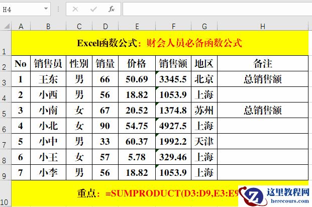 公式=SUMPRODUCT(D3:D9,E3:E9)的计算过程为:=D3*E3+D4*E4+D5*E5+D6*E6+D7*E7+D8*E8+D9*E9。