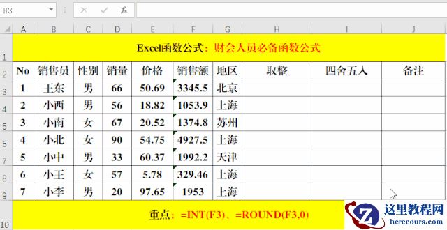 在目标单元格中输入公式:=INT(F3)或=ROUND(F3,0)。