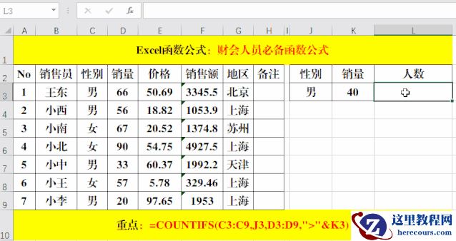 在目标单元格中输入公式:=COUNTIFS(C3:C9,J3,D3:D9,”>”&K3)。