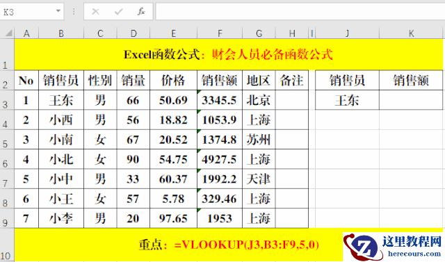 在目标单元格中输入公式:=VLOOKUP(J3,B3:F9,5,0)。