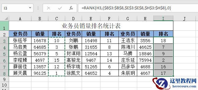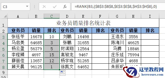 RANK函数的功能相信大家都不陌生,在这个例子中,主要利用RANK函数支持联合引用的特性,将($B$3:$B$8,$E$3:$E$8,$H$3:$H$8)以联合引用运算符逗号相隔,并用括号括起来作为RANK函数的第二个参数使用。