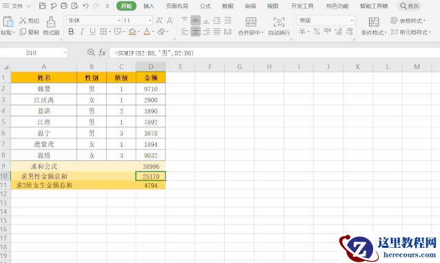 =SUMIF(B2:B8,”男”,D2:D8)