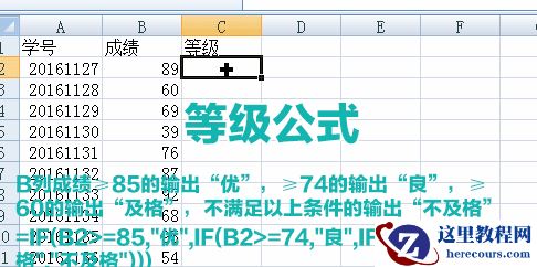 如B列成绩≥85的输出“优”,≥74的输出“良”,≥60的输出“及格”,不满足以上条件的输出“不及格”。条件公式↓