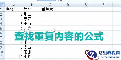 如我们想要查找B列(或其他行列)重复内容,同时在C列显示“重复”提示,公式如下↓