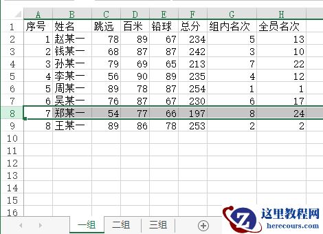 上述过程做完之后,当更改任一工作表中的成员成绩时,成员所在的“组内名次”和“全员名次”都会自动地发生相应改变。