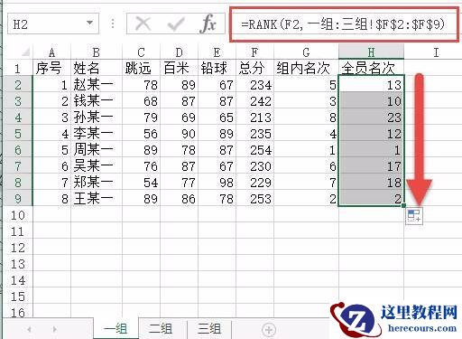 首先,选择名称是“一组”的工作表,点击“赵某一”所在的“全员名次”单元格H2;