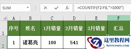 7、条件统计,在汇总列里求总销量在1000以上的人数,输入公式为“=COUNTIF(F2:F8,”>1000″)”;
