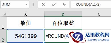 4、百位取整,公式为“=ROUND(A2,-2)”,有时候数值过大,我们希望将数据简化,取整到百位。(后面的“-2”是取整两位);