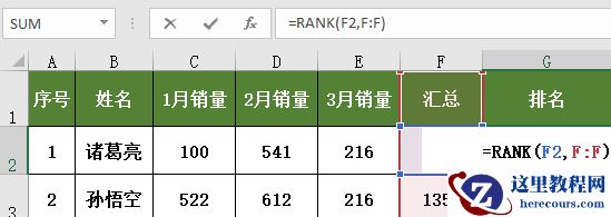 1、排名计算,这里用到的“RANK”函数,公式为“=RANK(E2,E:E)”,能够快速的帮助你计算出该区域中排名顺序;