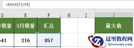 2、获取最大值,输入公式为“=MAX(F2:F8)”,可获取该区域中最大的一个值;