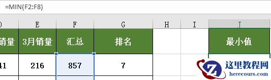 3、获取最小值,公式为“=MIN(F2:F8)”,可获取该区域中最小的一个值;