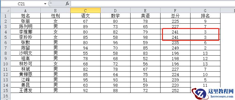 上面用RANK函数直接操作进行排名,会发现当遇到数值相同时,排名的名次也是相同的。