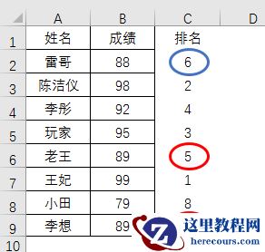 在C2单元格输入函数,=SUMPRODUCT((B2<=B$2:B$9)/COUNTIF(B$2:B$9,B$2:B$9)),然后用力将行数向下复制。
