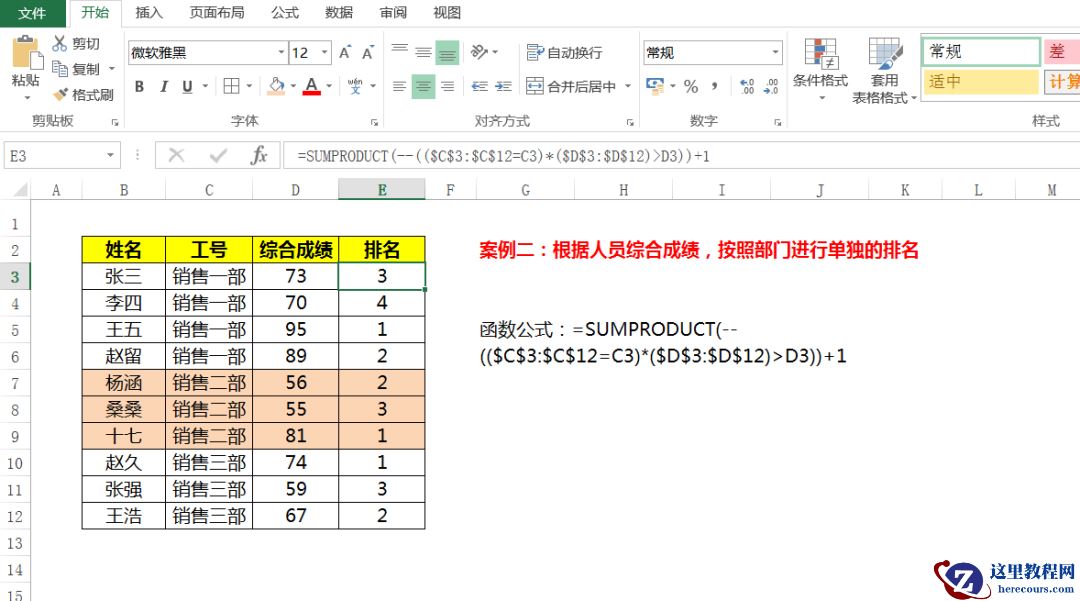案例二:根据人员综合成绩,按照部门进行单独的排名