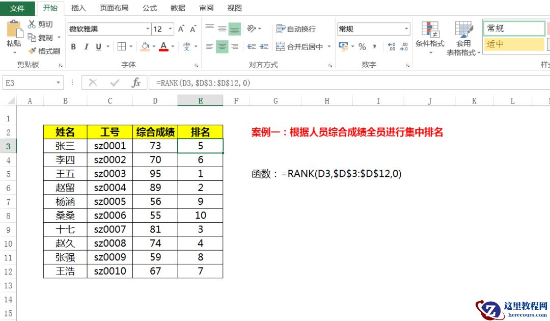 案例说明:我们需要对全部的人员,按照成绩从大到小进行综合排名,在这种集中简单排名操作下,我们用Rank函数就可以进行解决。
