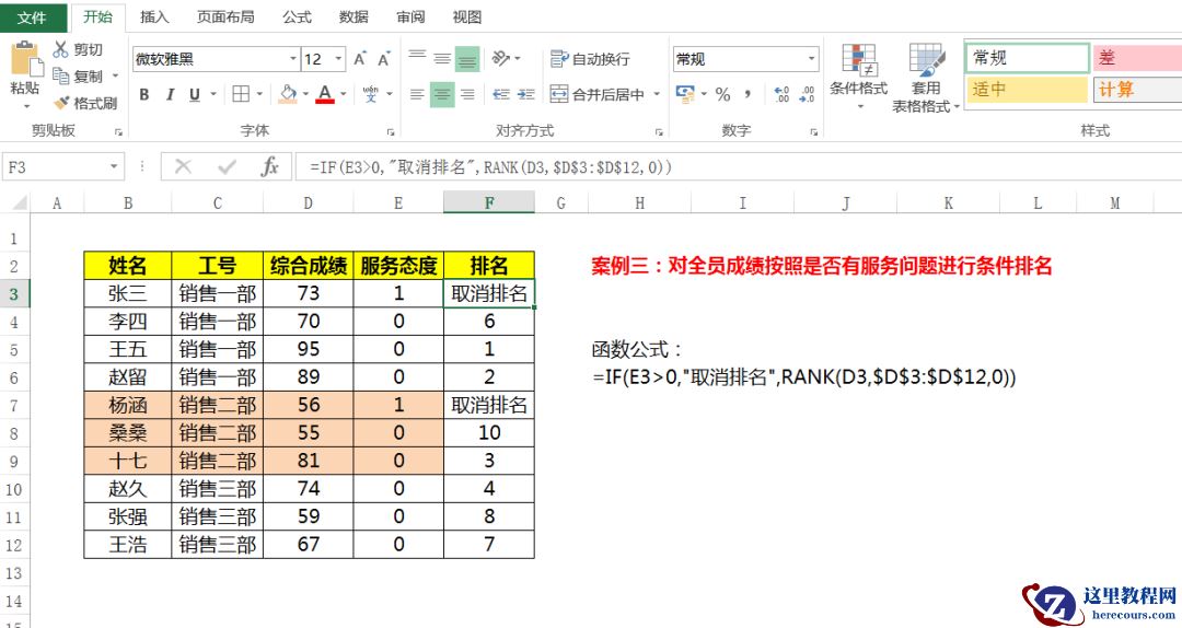 =IF(E3>0,”取消排名”,RANK(D3,$D$3:$D$12,0))