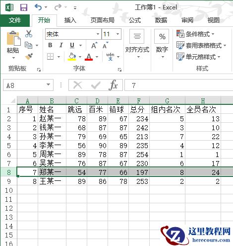 上述过程做完之后,当更改任一工作表中的成员成绩时,成员所在的“组内名次”和“全员名次”都会自动地发生相应改变。