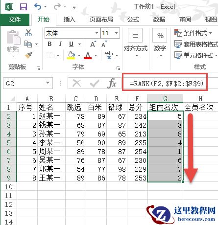 由于每个小组的成绩独占一个工作表,所以在一个工作表内利用RANK函数可以轻松的实现数据的排序。以计算“一组”工作表中名次为例。首先选择名称是“一组”的工作表,点击“赵某一”的“组内名次”所在的单元格G2;然后,在编辑栏输入“=RANK(F2,$F$2:$F$9)”;接下来,拖动填充柄进行数据填充就可以了。