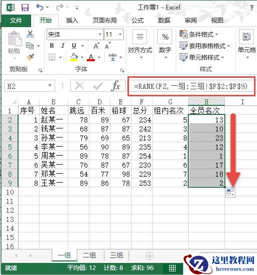 如果要跨越3张表进行综合数据排名,需要进行数据范围的跨表引用。首先,选择名称是“一组”的工作表,点击“赵某一”所在的“全员名次”单元格H2;然后在编辑栏输入“=RANK(F2,一组:三组!$F$2:$F$9)”;接下来,拖动填充柄进行数据填充就可以了。