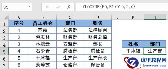 采用上述的公式,我们就很容易的查到于冰福的部门是生产部。