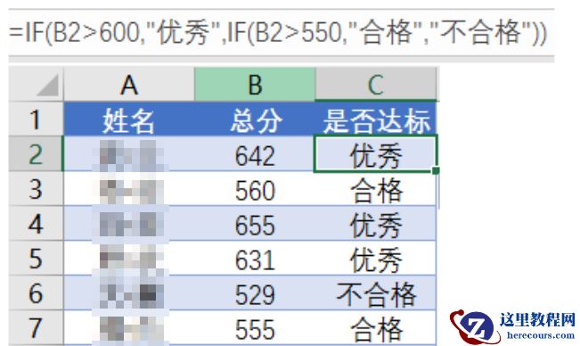 =IF(B2<550,”不合格”,IF(B2<600,”合格”,”优秀”))