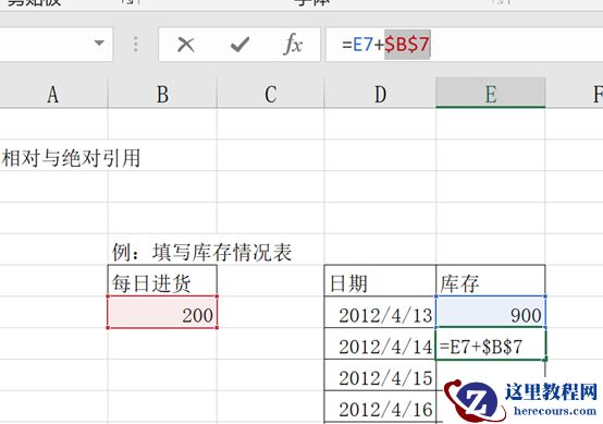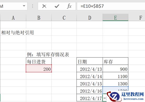 这个例子就是相对引用和绝对引用的共同使用,每日进货数,被绝对引用(行和列前都有美元符号),库存数采用相对引用,代表自己上面那个单元格,这个公式的含义就是,相对自己上面的单元格加上绝对位置的进货数,就是今天的库存数。