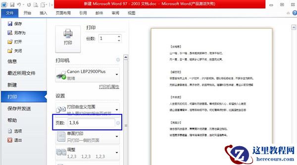 5、要选择打印的页码,可在“页数”中输入,输入“1,3,6”即打印第一页、第三页和第六页(如图);