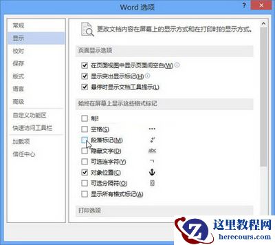 第2步,在打开的“Word选项”对话框中切换到“显示”选项卡,在“始终在屏幕上显示这些格式标记”区域取消“段落标记”复选框,并单击“确定”按钮,如图2所示。