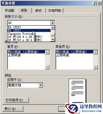 第2步,打开Word2003文档“页面设置”对话框,切换到“纸张”选项卡。在“纸张大小”下拉列表中选择合适的纸张的类型,例如选择“B5(JIS)”纸张,如图所示。