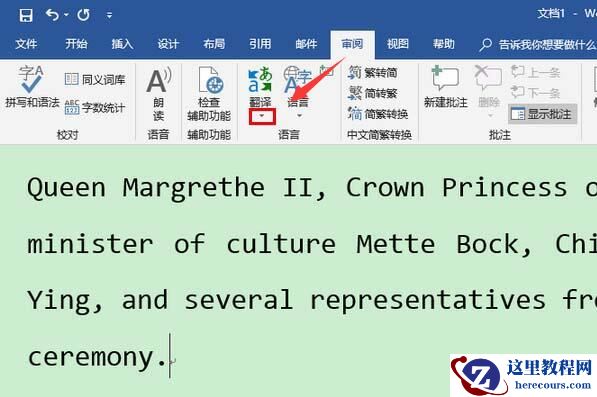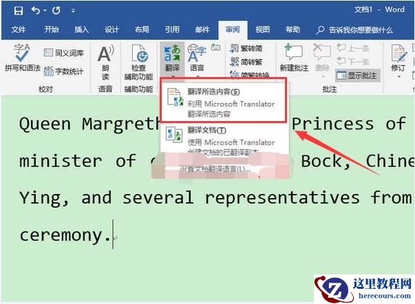 Word2019划词翻译在哪?审阅——翻译下边的向下箭头,选择“翻译所选内容”。