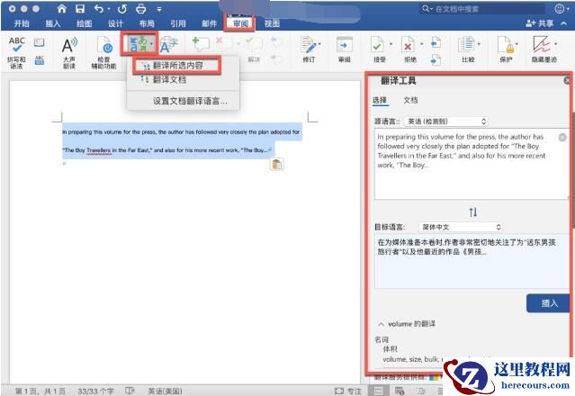 选择“审阅”》“翻译”》“翻译所选文字”。