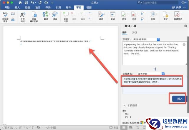 选择“插入”。 已翻译的文字将替换在步骤 1 中突出显示的文字。
