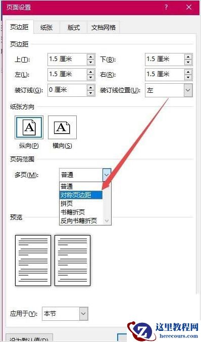 6、另外我们也可以设置纸张为A4,然后在页码范围一项中,把多页的下拉菜单设置为“对称页边距”菜单项,这样也可以把A4的幅面变成了A5的大小。