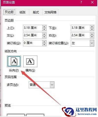 3、在打开的页面设置窗口中,把纸张方向设置为“纵向”