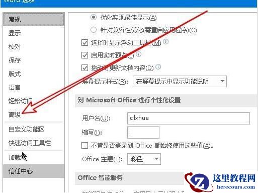 4、这时就会打开Word的选项窗口,在窗口中点击左侧边栏的“高级”菜单项。