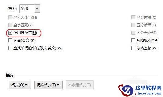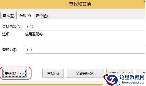 输入成功后,我们需要设置“使用通配符”,点击“更多(M)”选项,有的Word版本点击“高级搜索(L)”。