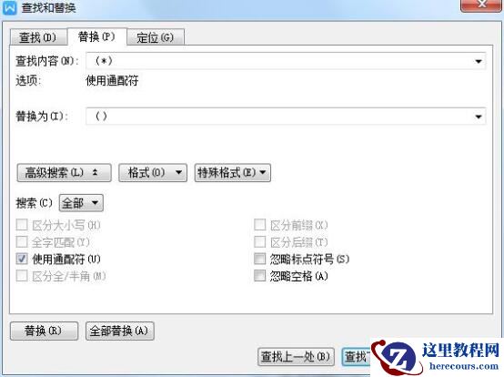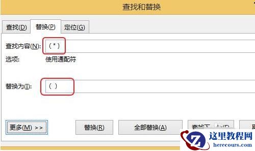 在弹出的窗口中在查找内容中输入“(*)”,替换为中输入“()”,如下图所示