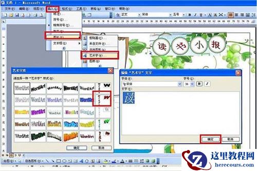 4、设置小报主题。点击插入——图片——艺术字——选择一种艺术类型输入文字,如这里分别写上读书小报四个艺术字摆放在四个小圆那里。