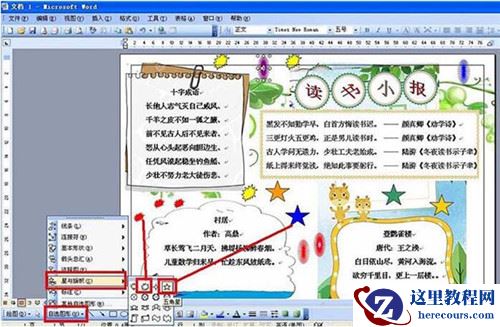 6、添加星与旗点缀。点击自选图形——选择星与旗,然后画一些星星或形状,然后也是双击设置不同的填充颜色,点击在小报的各个地方。