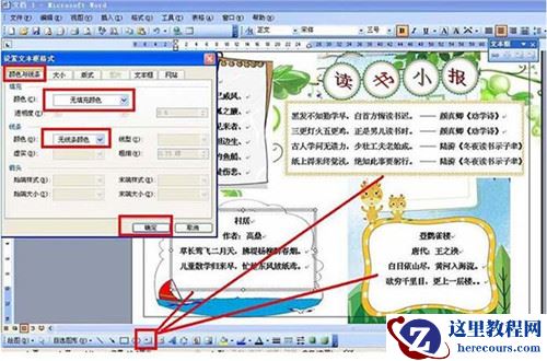 5、输入小报的读书内容:点击横排文本框——输入文字并设置大小居中——双击文本框——颜色和线条——填充颜色和线条颜色者设置为:无填充颜色,然后点击确定。