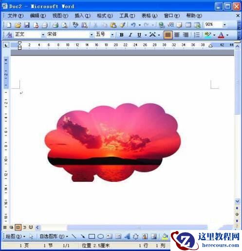 2、进入Word中,利用“绘图”工具栏上的相关按钮,根据裁剪的需要,在文档中绘制出一个封闭的异形图形。此处,为了方便,我们直接用“云形标注”自选图形来操作(如图1)。